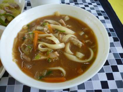 鶏肉、かまぼこを主材に赤みそ、八丁みそで味付けした、きしめんです。