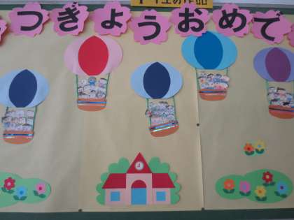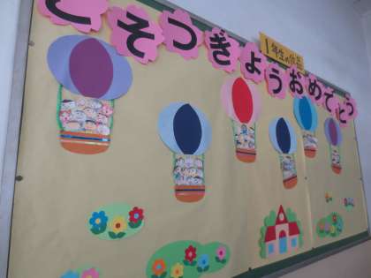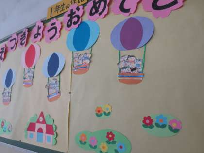 2階の廊下掲示板に1年生のメッセージがはられています。気球に乗って笑顔いっぱいに大空へ飛び立つ、お姉さん、お兄さんたちに「おめでとう」と祝福しています。