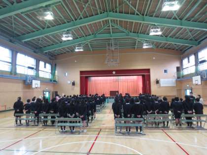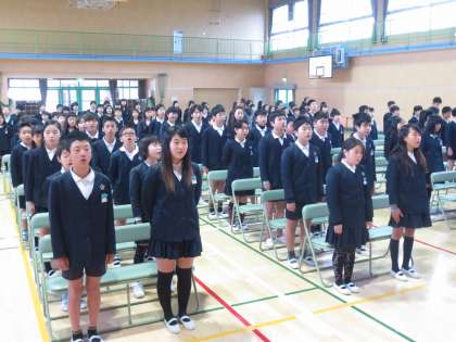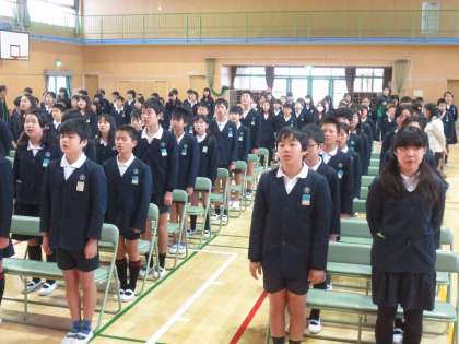 静かな講堂に、君が代、大阪市歌、校歌の歌声が響きわたっていました。6年生の歌声は卒業に向けての決意が感じられました。