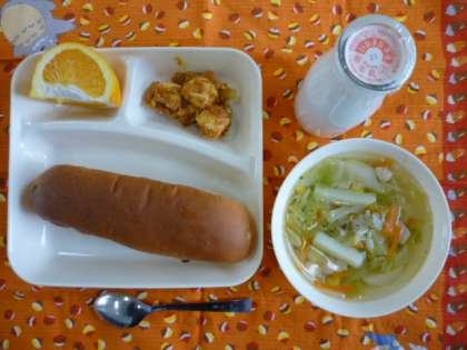 とうふのミートグラタン、スープ、はっさく、レーズンパン、牛乳