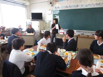 明日、6年生は巽南小学校より巣立っていきます。卒業生にとって今日が最後の給食です。グループごとに様子を載せています。【6年1組の給食1】
