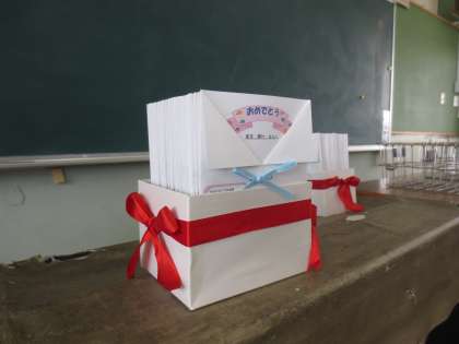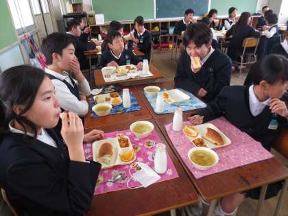 この給食の時間、保健室の山本先生から卒業生に、保健室メッセージ(成長の記録)が届けられました。「1年生のときの身体と今の身体との比較を、手作り資料を作り一人一人にプレゼントします。お家に帰ってから家族の方々と、1年生のときのことを思い出しながらゆっくり見て下さいね。」