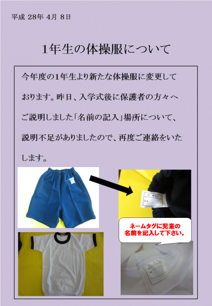 今年度の1年生より新たな体操服に変更しております。昨日、入学式後に保護者の方々へご説明しました「名前の記入」場所について、説明不足がありました。申し訳ありません。再度ご連絡をいたします。