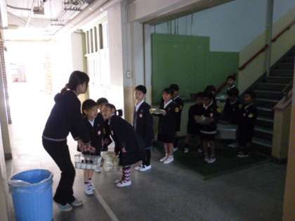 食缶・食器等を自分たちで給食室に片づけに行きます。