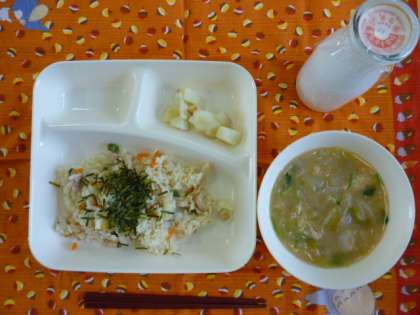 かやくご飯、みそ汁、焼きじゃが、牛乳