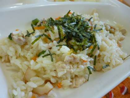 鶏肉、ちくわ、にんじん、三度豆を甘辛くたき、たきあがったご飯に混ぜています。