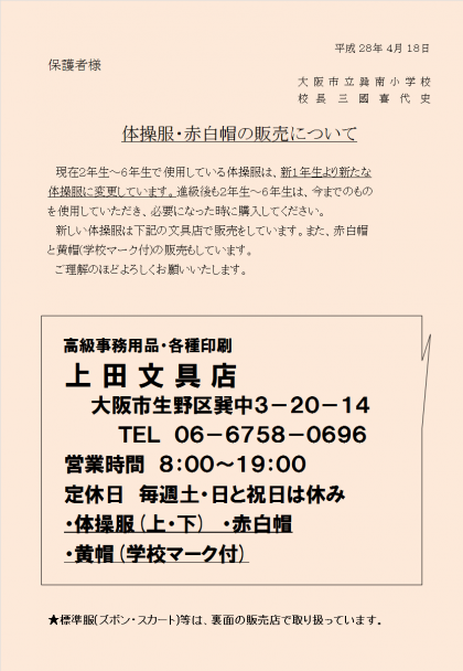 現在2年生〜6年生で使用している体操服は、新1年生より新たな体操服に変更しています。進級後も2年生〜6年生は、今までのものを使用していただき、必要になった時に購入してください。新しい体操服は下記の文具店で販売をしています。また、赤白帽と黄帽(学校マーク付)の販売もしています。ご理解のほどよろしくお願いいたします。