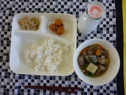 まぐろのオーロラ煮、じゃがいもと野菜の含め煮、もやしのあえもの、ご飯、牛乳