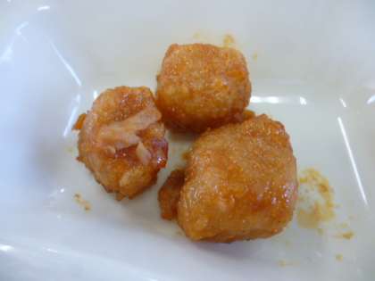 角切りのまぐろを油であげ、ケチャップ、赤みそ、砂糖で作ったタレをからめます。