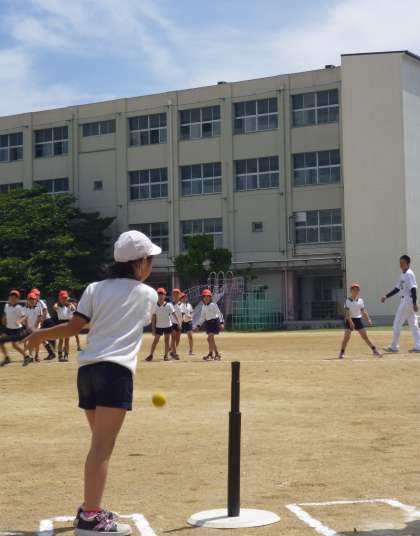 バッティングティーという細長い台の上に置いたボールをバットで打つゲームをしました。野球によく似たゲームですが、投手がボールを投げるのではないので、初めての子もバットでボールを打つことができます。