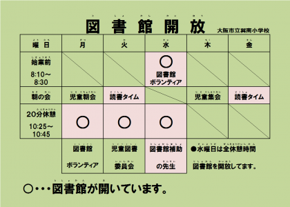 朝の時間や休憩時間に図書館を開放しています。図書館ボランティアの方々、図書館補助員の先生が図書館を開いていただいています。また、図書委員会の児童も協力して図書館を開けてくれます。学級での「読書タイム」や生野区図書館あじさいブッククラブの方々による「本の読み聞かせ」もしていただき、今年度も読書への興味を高める取り組みしてまいります。ご家庭でも読書の機会を増やしていただけますようご協力よろしくお願いいたします。