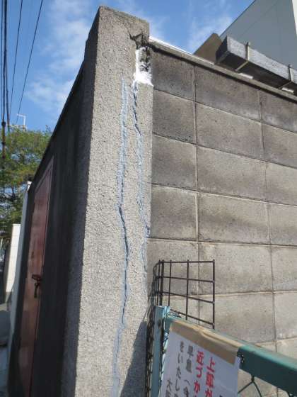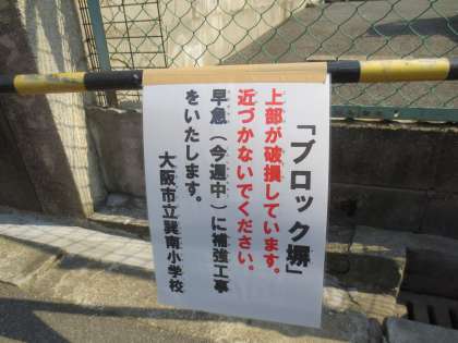学校の西門付近にあるブロック塀が、地震の後、大きな亀裂ができ工事が必要となりました。教育委員会にも確認していただき、今後、危険な状態になる前に工事を行うことになりました。しばらく工事付近の方々にはご迷惑をおかけいたしますが、ご理解ご協力のほどよろしくお願いいたします。