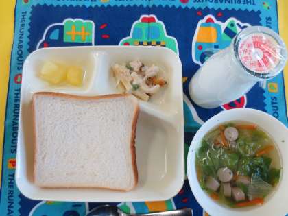 マカロニグラタン、レタスのスープ、りんご(缶)、食パン、バター(キューブ)、牛乳