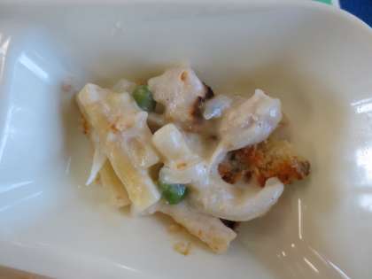 鶏肉とマカロニが入った、白いグラタンです。子ども達に人気のメニューです。