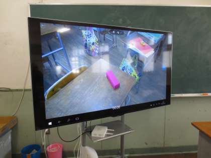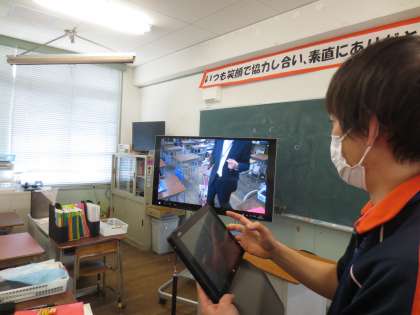 今年度、50型TVが各学年1台とダブレット40台が学校に入りました。教室で50型TVとタブレットの通信(ワイヤレス)を確かめています。これから校内研修会をして学習に活用していきます。