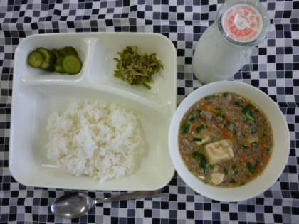 マーボーどうふ、きゅうりの甘酢づけ、じゃこピーマン、ご飯、牛乳