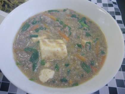 牛挽肉、豚挽肉を主材に、とうふ、たまねぎ、にんじん、にらなどが入ったマーボーどうふです。
