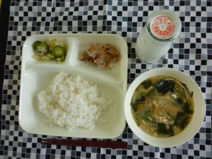 豚肉のしょうが焼き、みそ汁、キャベツときゅうりのかつお梅風味、ご飯、牛乳