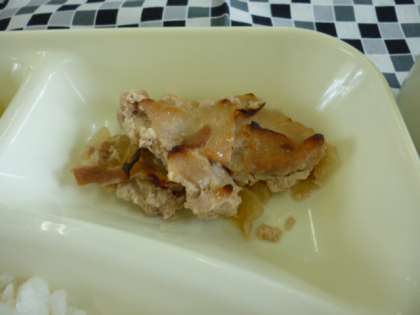 豚肉、たまねぎをしょうが汁、砂糖、料理酒、みりん、こい口しょうゆで下味をつけ焼いています。