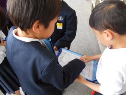 それぞれの部屋や場所の説明を2年生が1年生にしました。学習カードにはその場所のシールを貼りました。
