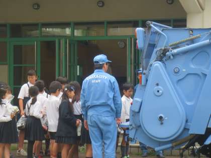 大阪市環境事業局の方々が、出前授業に来てくださいました。子どもたちは自分たちで、パッカー車にペットボトルや空き缶などの再生できるゴミを入れていました。