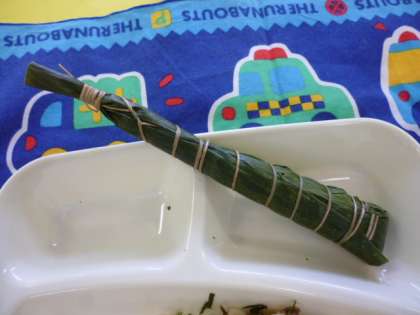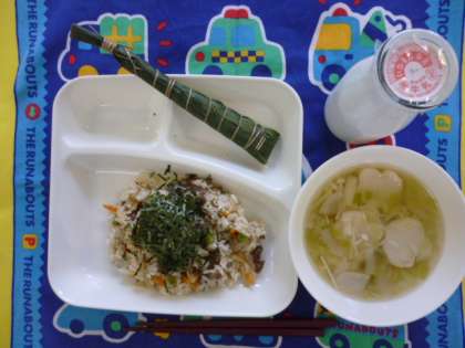 こどもの日の行事献立です。こどもたちの成長を願って「ちまき」をつけています。