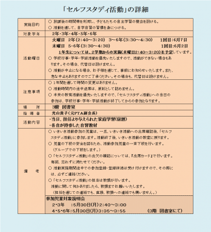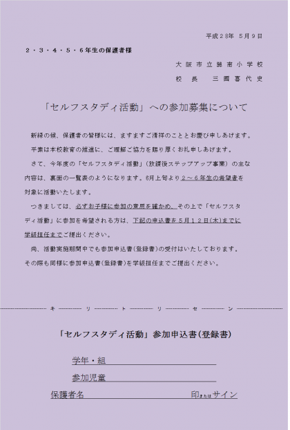 参加を希望される児童は、5/9配付します申込書に、児童名、保護者名等を記入され、学級担任までご提出下さい。この自主学習の機会から、家庭での学習習慣の定着へとつなげていって下さい。