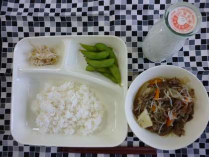 肉じゃが、もやしのゆずの香あえ、枝豆、ご飯、牛乳