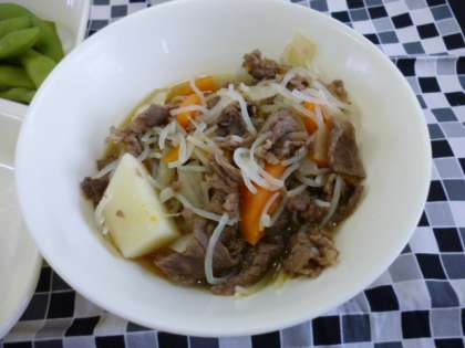 牛肉を主材にじゃがいも、糸こんにゃく、たまねぎ、にんじん、の入った煮ものです。
