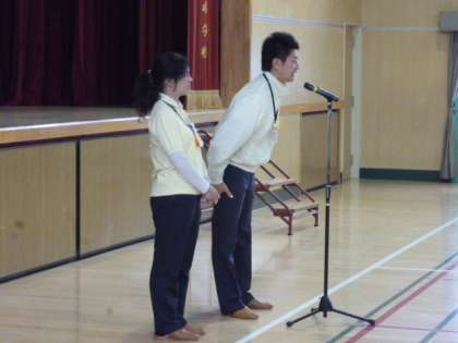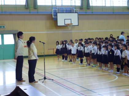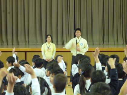 生野区いくみんパトロール隊 薮野(やぶの)さん、彌栄(みえ)さん、のお二人にご挨拶とお話をしていただきました。2年生以上の児童は以前から見守りをしていただいています。また、ガチメン大会で審判をしていただいているので、近所のお兄さんお姉さんのように顔見知りになっています。これからもよろしくお願いいたします。