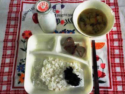 豚肉のしょうゆマヨネーズ焼き、けんちん汁、のりのつくだ煮、ご飯、牛乳