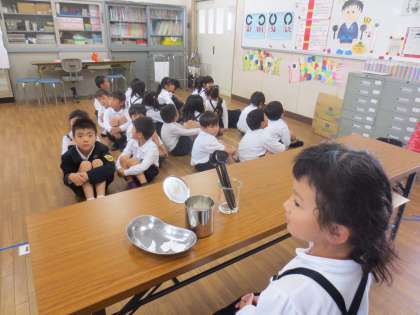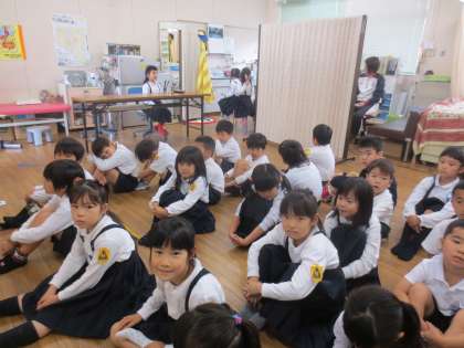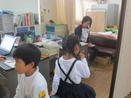 保健室で1年生が視力検査をしていました。とても静かに順番を待っています。