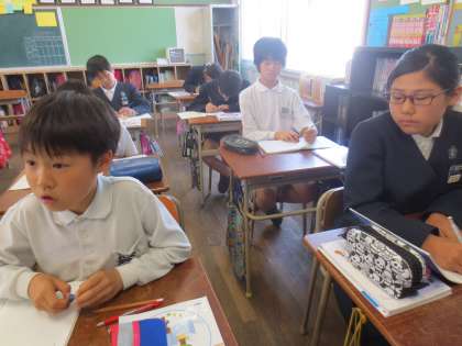 少人数で算数科(分数のかけ算)の学習に取り組んでいます。一人一人が真面目に取組んでいます。