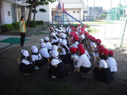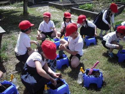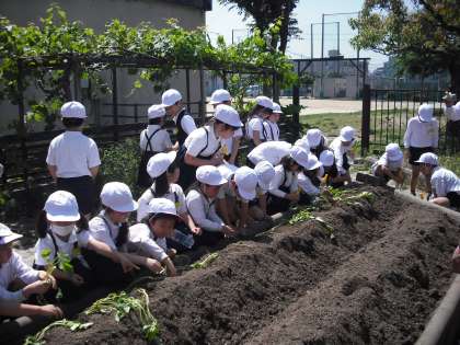 学習園には、サツマイモ。一人ずつの鉢にはミニトマトを植えました。はじめに植え方の説明を聞いて、スタートです。古い土に栄養たっぷりの新しい土をまぜて、そっと苗を植えました。最後に水をたっぷりあげました。