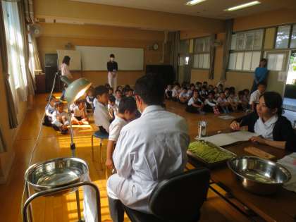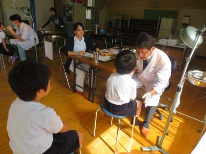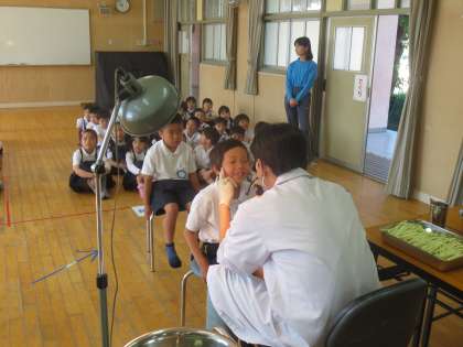 今日は全学年が歯科検診で、1年生から順に多目的室で検診をします。2人の歯科医の先生に診ていただいています。学校医の栃谷先生と萬田先生は、本校児童のよくご存じで、子どもたちも安心しているようでした。