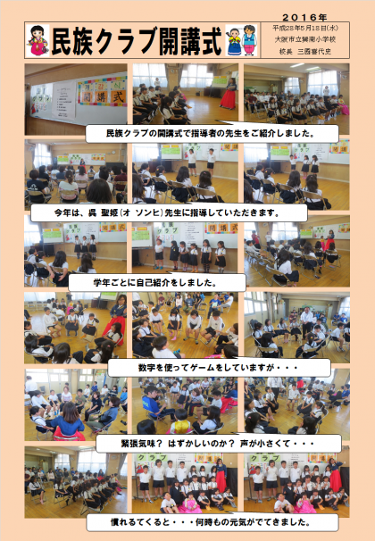 昨日5/18(木)、民族クラブの開講式をしました。初めに、巽南小学校の指導者として、呉 聖姫(オ ソンヒ)先生を紹介しました。次に、児童が自己紹介と得意な事、学びたい事を発表しました。最後に、みんなで数字ゲームを楽しくしました。