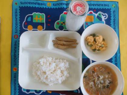 きびなごてんぷら、みそ汁、えんどうの卵とじ、ご飯、牛乳
