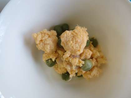 生のえんどう豆をさやから出して、鶏肉といっしょに煮て卵でとじます。
