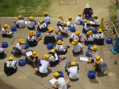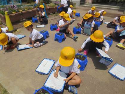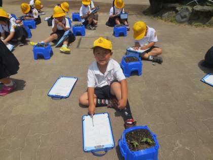 毎朝1年生は、生活科の学習で植えた「アサガオ」の種に水をあげていました。世話をしたことで種から芽がたくさんでてきました。今日はレインボーパークで育てている「アサガオ」の観察です。一人一人が絵と文でしっかりと記録しています。