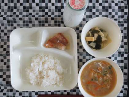 赤魚のしょうゆだれかけ、みそ汁、わかたけ煮、ご飯、牛乳
