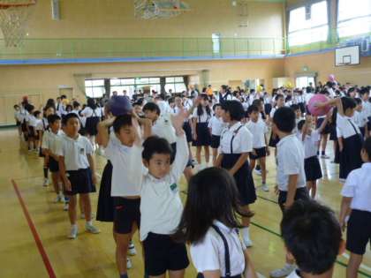今日の集会は、「ボール送りゲーム」でした。