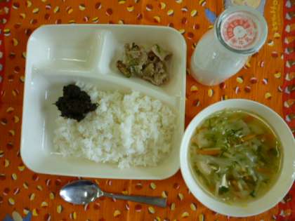 豚肉のごまみそ焼き、すまし汁、のりのつくだ煮、ご飯、牛乳