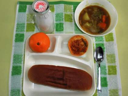 豚肉と野菜のカレー煮、変わりピザ、みかん、黒糖パン、牛乳