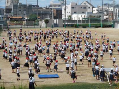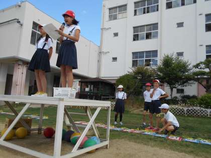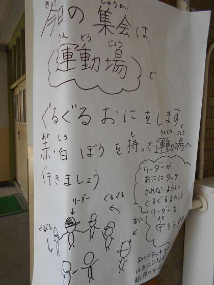 班のプラカードを班長がもち、縦割り班ごとに集合しています。集会委員会の児童が今日のゲーム「ぐるぐるおに」の説明をしています。