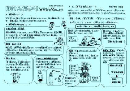 日増しに気温が高くなってまいりました。これからの季節は熱中症に注意する必要があります。熱中症の予防について「保健だより」に載せています。ご参考にしてください。