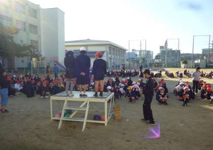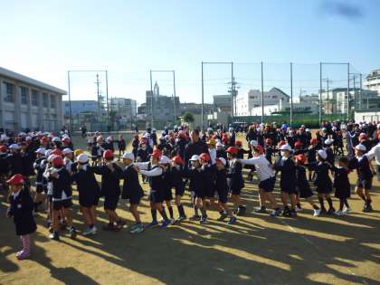 いろんな学年の児童がジャンケンをしながら連なっていきます。一度もジャンケンに負けずに列車の先頭をいくのは誰かな?