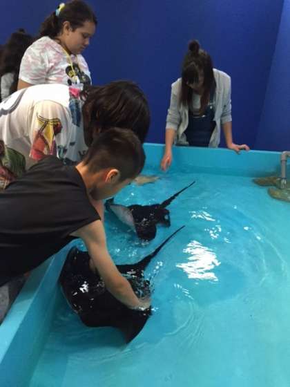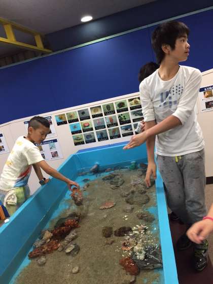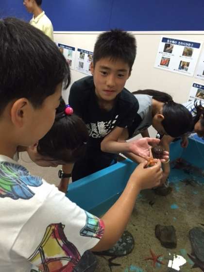 いろいろな海の生き物のふれあい体験がありました。はじめは、なかなかさわれなかったけれども、何とかふれることができました。
