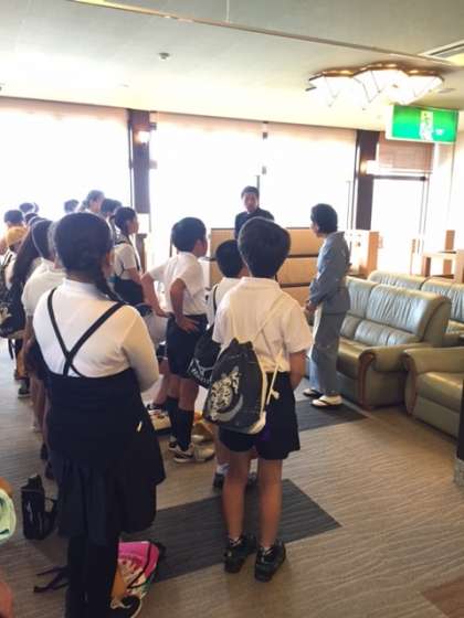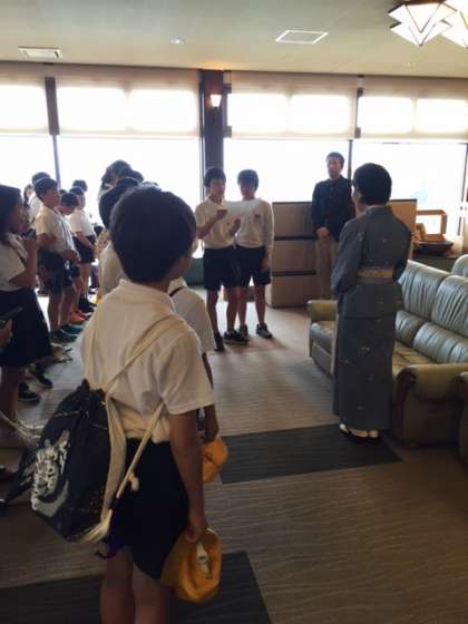 もう時間です。宿舎ともお別れです。お世話になった宿舎の方に児童代表の人がお礼とあいさつをしました。みんなも「ありがとうがざいました!」
