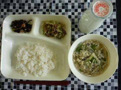 牛肉とキャベツのいためもの、かきたま汁、枝豆入りひじき、ご飯、牛乳