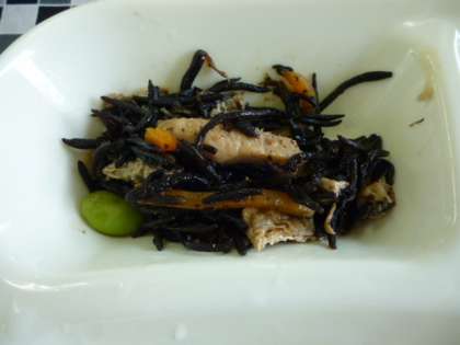 鶏肉、うすあげ、ひじき、にんじん、枝豆を甘辛く煮こんでいます。